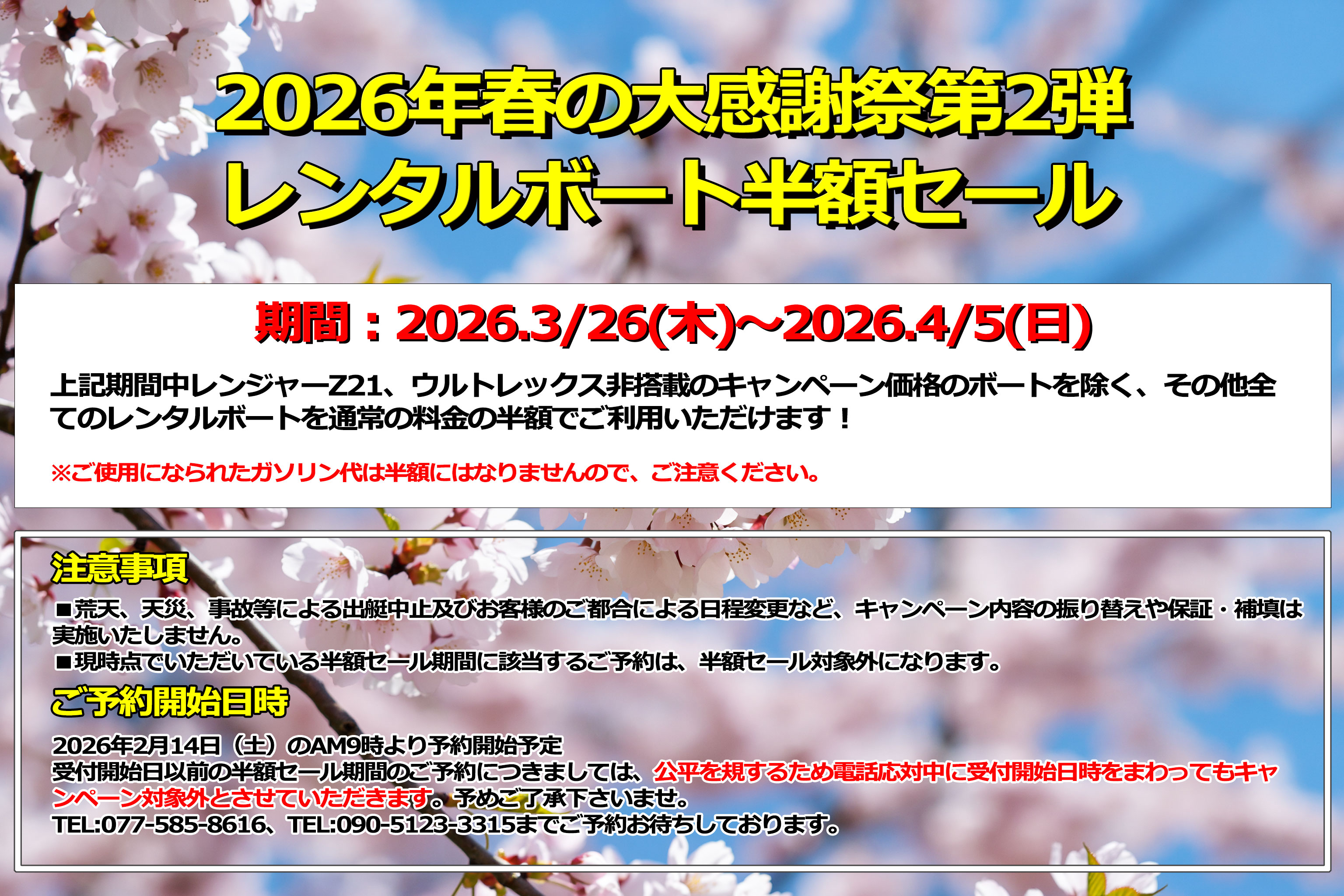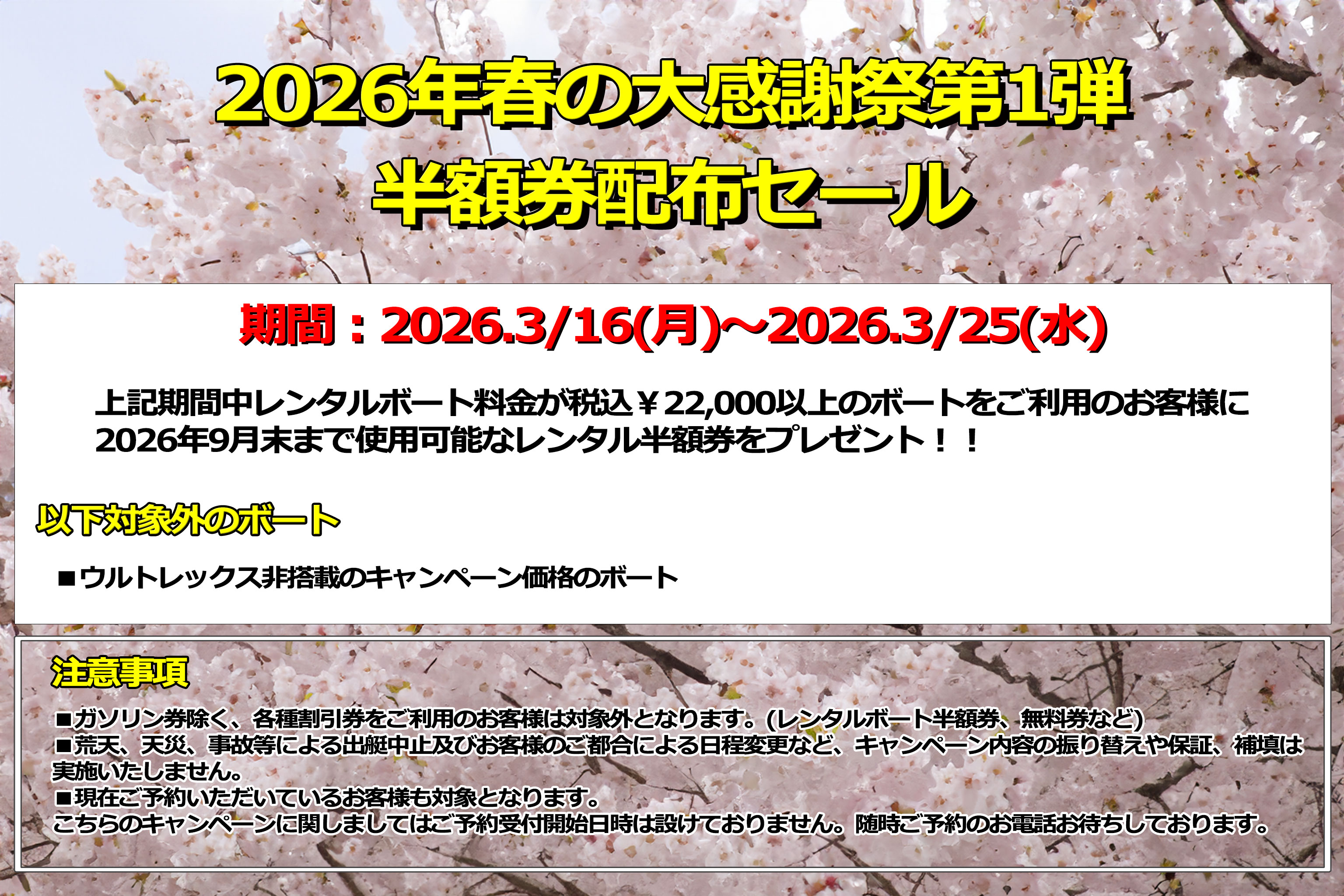期間中、税込¥22,000以上のボート(ウルトレックス非搭載のキャンペーン価格のボートを除く)を御利用のお客様に次回以降お使い頂けるレンタル半額券(使用期限2026年9末まで)をプレゼント!